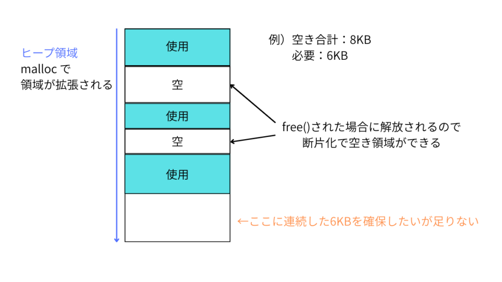 この場合、連続したメモリ領域が必要になるため、断片化による確保失敗が起こりやすくなります。