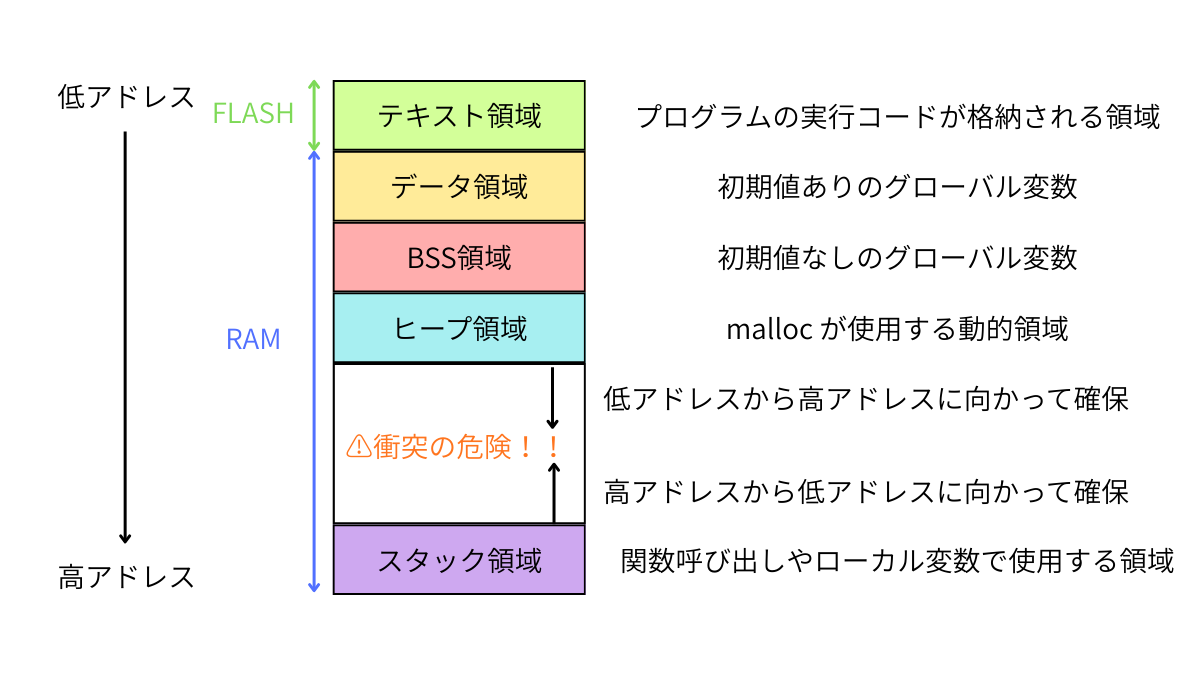 データ領域、BSS領域、スタック領域を含むメモリ領域の全体像についてはこちらの記事で解説しています。